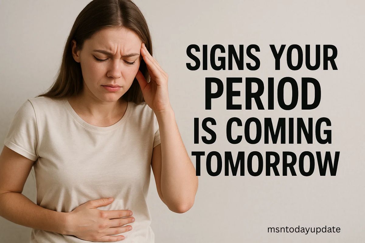 Mild to moderate cramping is often one of the first signs your period is coming tomorrow. The uterus contracts to shed its lining, causing pain in the lower abdomen. For some women, cramps begin as early as 24 hours before bleeding starts.